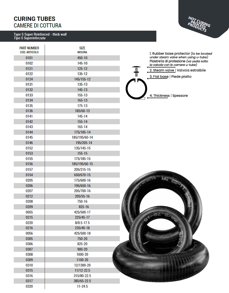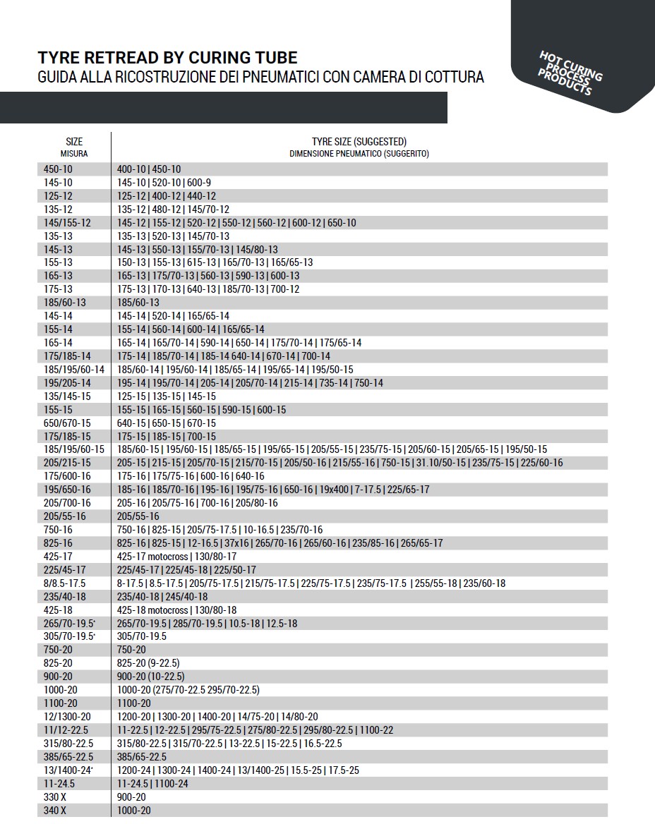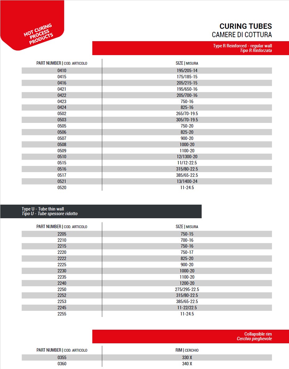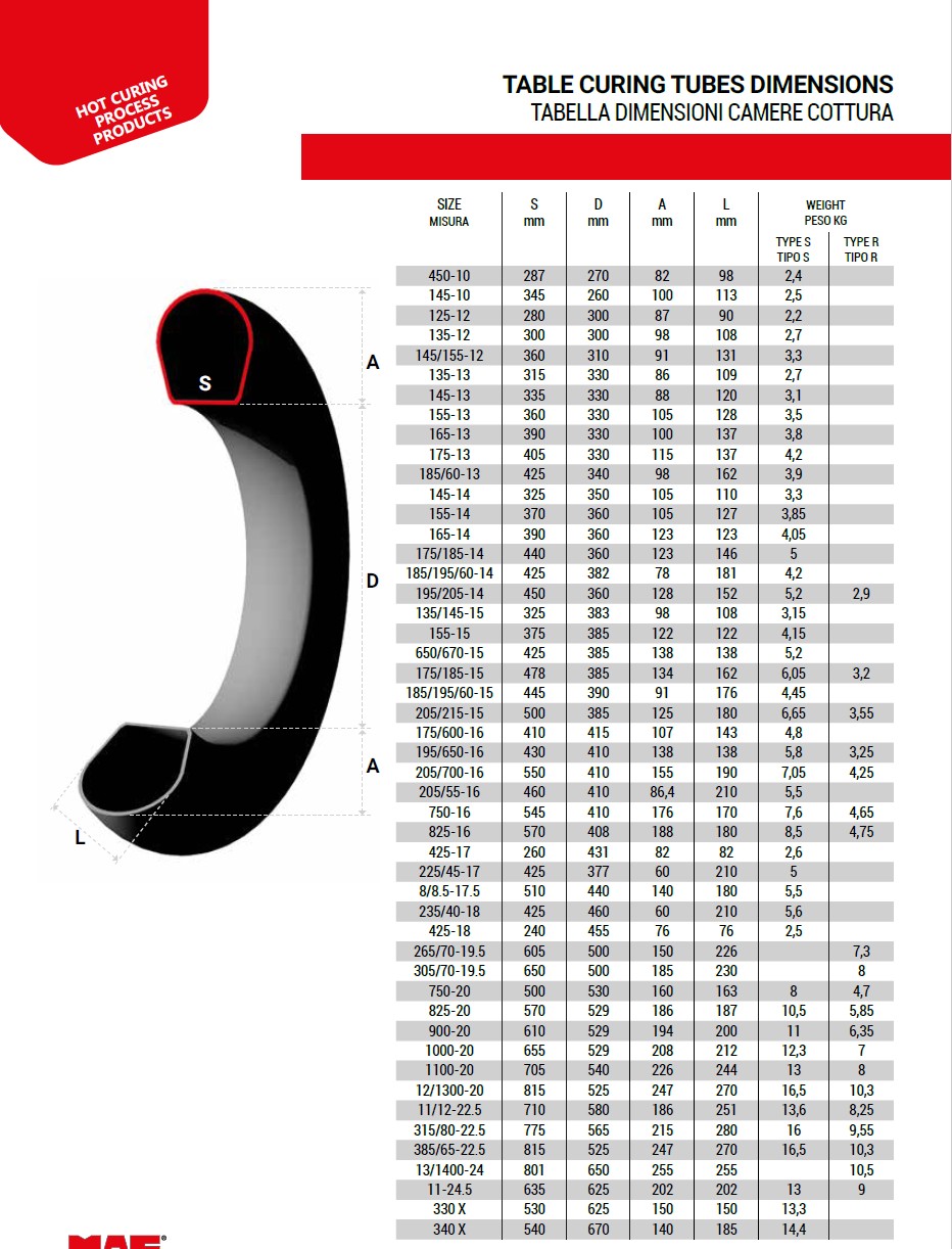 The complete size range for curing tubes can be located on pages 19 through 22 of the MAE product catalog
