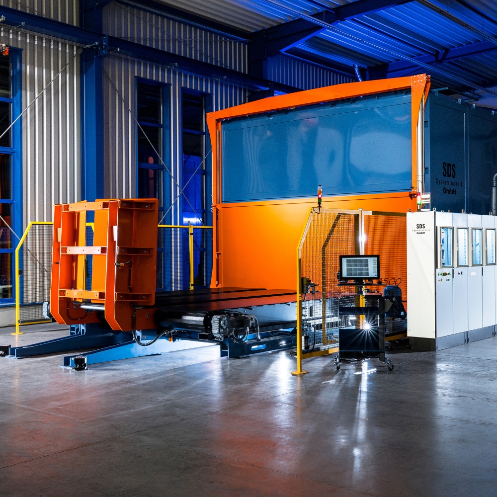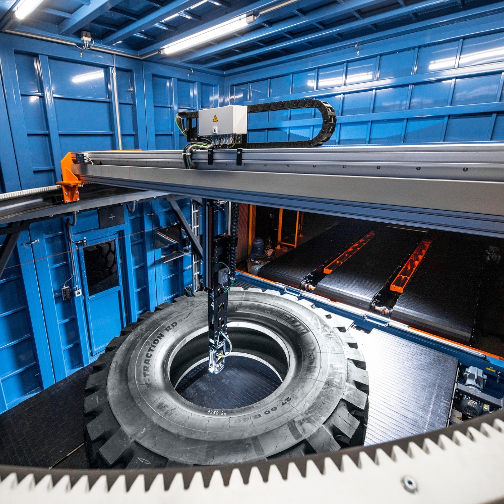 from the measuring system. The tire handling with a modular shuttle system loads the tire automatically